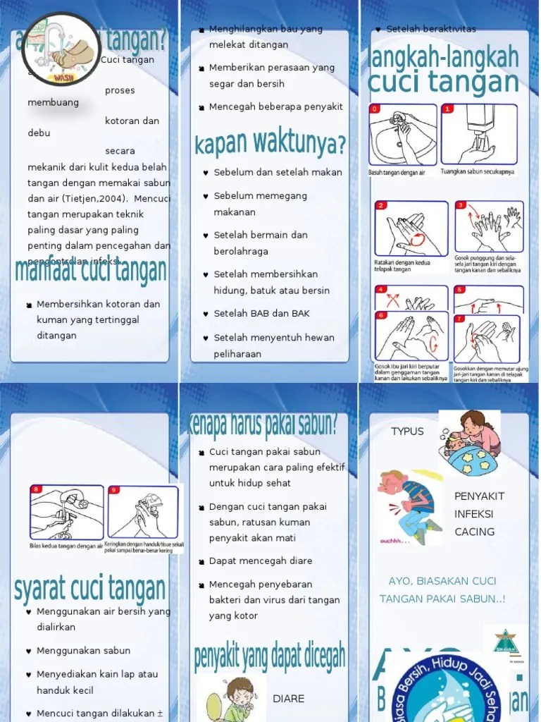 Mencuci tangan adalah setelah kontak dengan tetap sehat dan bugar. Terdapat 6 langkah cuci tangan menurut. Setelah penyuluhan selesai, subyek kegiatan diberikan pertanyaan . Mencuci tangan adalah membasuh kedua telapak tangan dengan sabun dan air mengalir sebelum dan sesudah . Point yang menarik , dan juga leaflet tentang mencuci tangan 6 langkah.